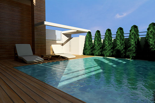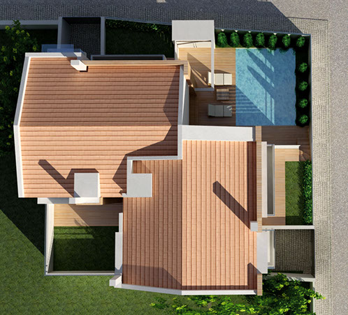 The pool in the front courtyard is the common relaxation area of the two residences.