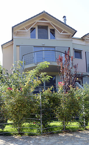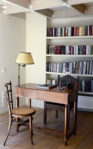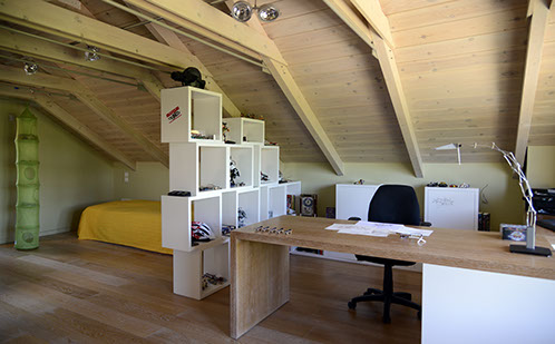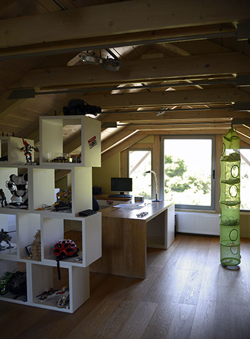 The layout is composed in three zones, one on each level. The living area and the kitchen with the dining room are on the ground floor, the master bedroom with an office on the 1st floor and a bedroom with its own bathroom in the attic space.