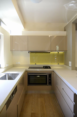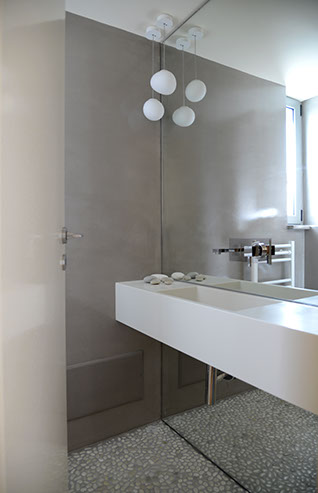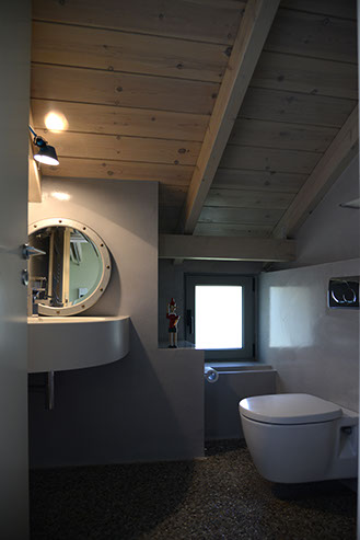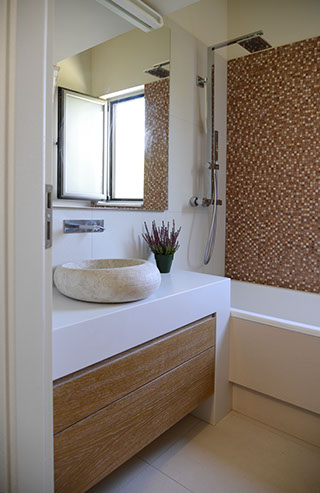 Therefore, for the resting areas and the bedrooms, a natural wooden color was chosen, for the two baths colored cement mortar was applied on the walls and pebbles on the floor, while the walls and the floor in the main bathroom is cladded with a light colored stone. The baths’& kitchen’s counter-tops are made of quartz and cabinets of  oak and  off-white lacquer.