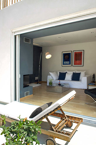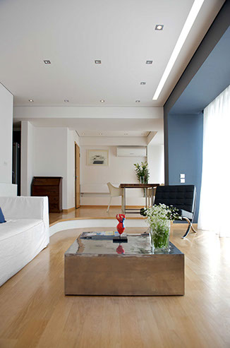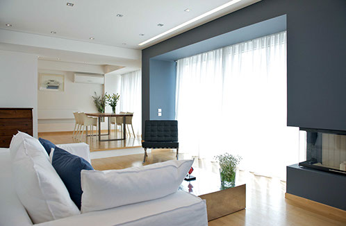 Through the large window a spectacular view of the Acropolis can be seen set against a dark colored wall. The sliding glass panels open, disappearing into the wall, thus converting the balcony into the living room’s continuation.