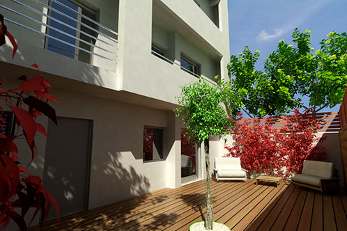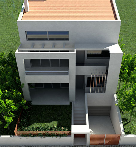The building is placed tangentially to the two lateral boundaries of the site so as lighting & ventilation are achieved through large openings in the north-south direction. An external staircase is designed to give access to the house on the first floor, assuring autonomy to each residence.