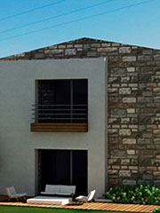 The main volume consisted of a space with a studio loft above that is connected by simple floating stairs. The stone parallel walls determine the strictly geometrical shape of the house when the large windows give the feeling that there are no clear boundaries between the living areas and the open spaces, as imposed by the verdant landscape itself.