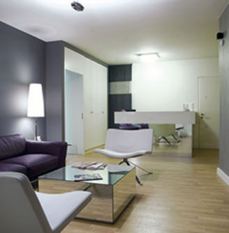 The construction of a grey colored wall built perpendicularly to the large windows divided the space into two zones, one hosting the examination room and the doctor’s office and on the other side, the reception and the lounge.