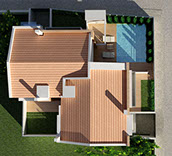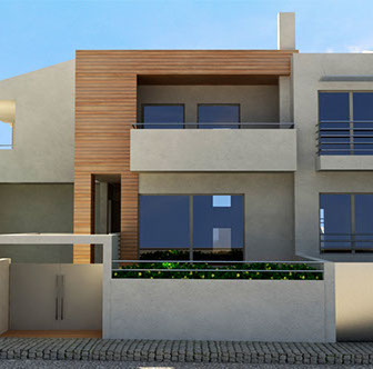 The two houses are vertically connected with the areas that hosts their individual entrances and staircases making them face to two different roads so as to be functional and visually independent.