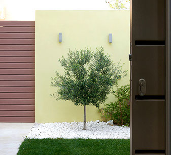 The olive tree against a colored surface, dominates in the small courtyard of the house.