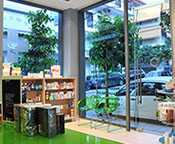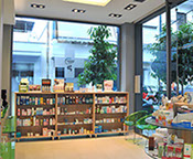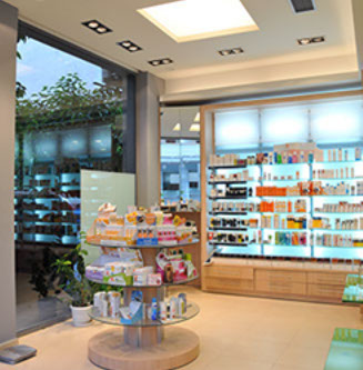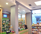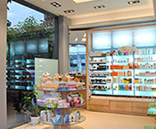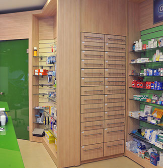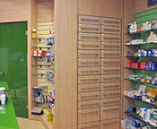 The two storey hight pharmacy allowed the installation of an heating-cooling system on the roof where the air vents are concealed in the gypsum board ceiling.