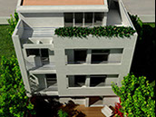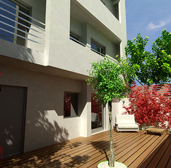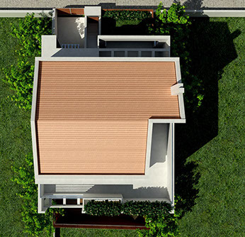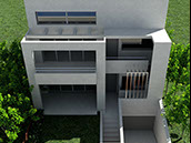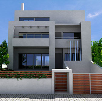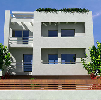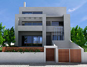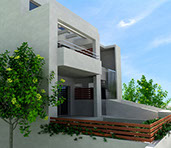 The building is placed tangentially to the two lateral boundaries of the site so as lighting & ventilation are achieved through large openings in the north-south direction. An external staircase is designed to give access to the house on the first floor, assuring autonomy to each residence.