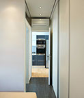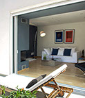 Through the large window a spectacular view of the Acropolis can be seen set against a dark colored wall. The sliding glass panels open, disappearing into the wall, thus converting the balcony into the living room’s continuation.