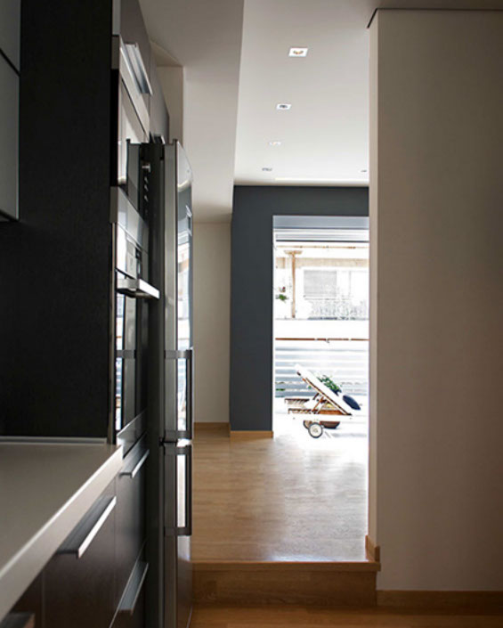 The design’s aim was the creation of a united, flexible space that would offer convenience, since the layout was too restrictive. Because of the existence of an inverted beam the plan was necessarily organized in two levels. Thus, the entrance and the dining room are elevated from the living room, kitchen, bedroom and bathroom.
