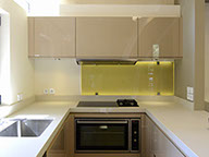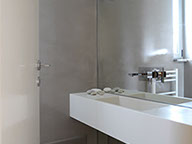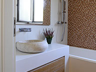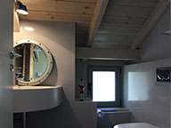 Therefore, for the resting areas and the bedrooms, a natural wooden color was chosen, for the two baths colored cement mortar was applied on the walls and pebbles on the floor, while the walls and the floor in the main bathroom is cladded with a light colored stone. The baths’& kitchen’s counter-tops are made of quartz and cabinets of oak and off-white lacquer.