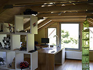 The layout is composed in three zones, one on each level. The living area and the kitchen with the dining room are on the ground floor, the master bedroom with an office on the 1st floor and a bedroom with its own bathroom in the attic space.